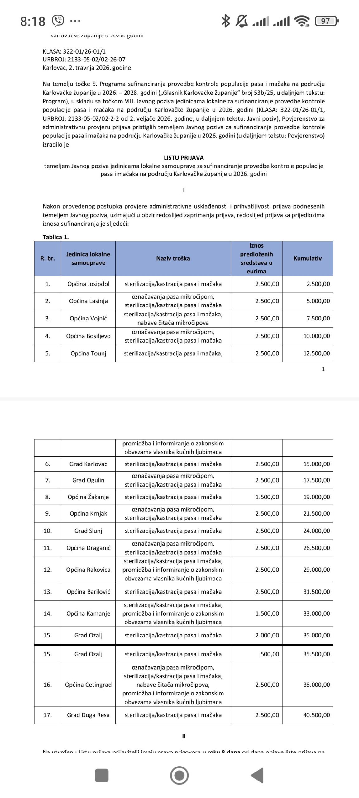 Poštovani građani,obavještavamo vas da je Općina ostvarila sredstva u iznosu od 2.500,00 eura temeljem Javnog poziva Karlovačke županije za sufinanciranje provedbe kontrole populacije pasa i mačaka u 2026. godini. Dobivena sredstva namijenjena su sufinanciranju...