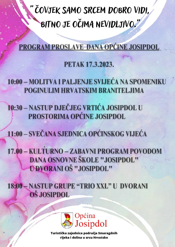 Čast nam je i zadovoljstvo pozvati Vas na svečano obilježavanje Dana Općine Josipdol koje će se održati u petak 17.03.2023. godine.